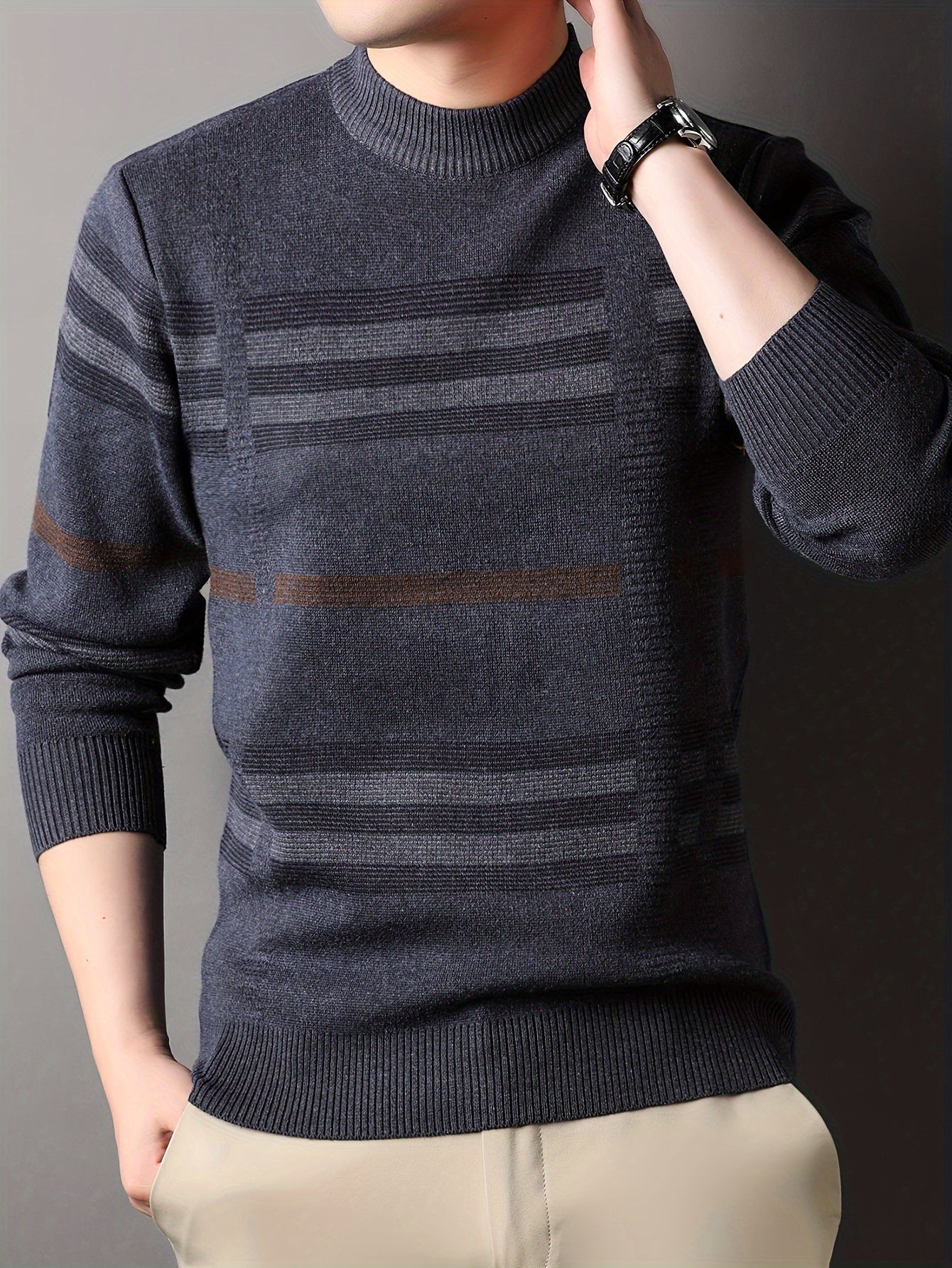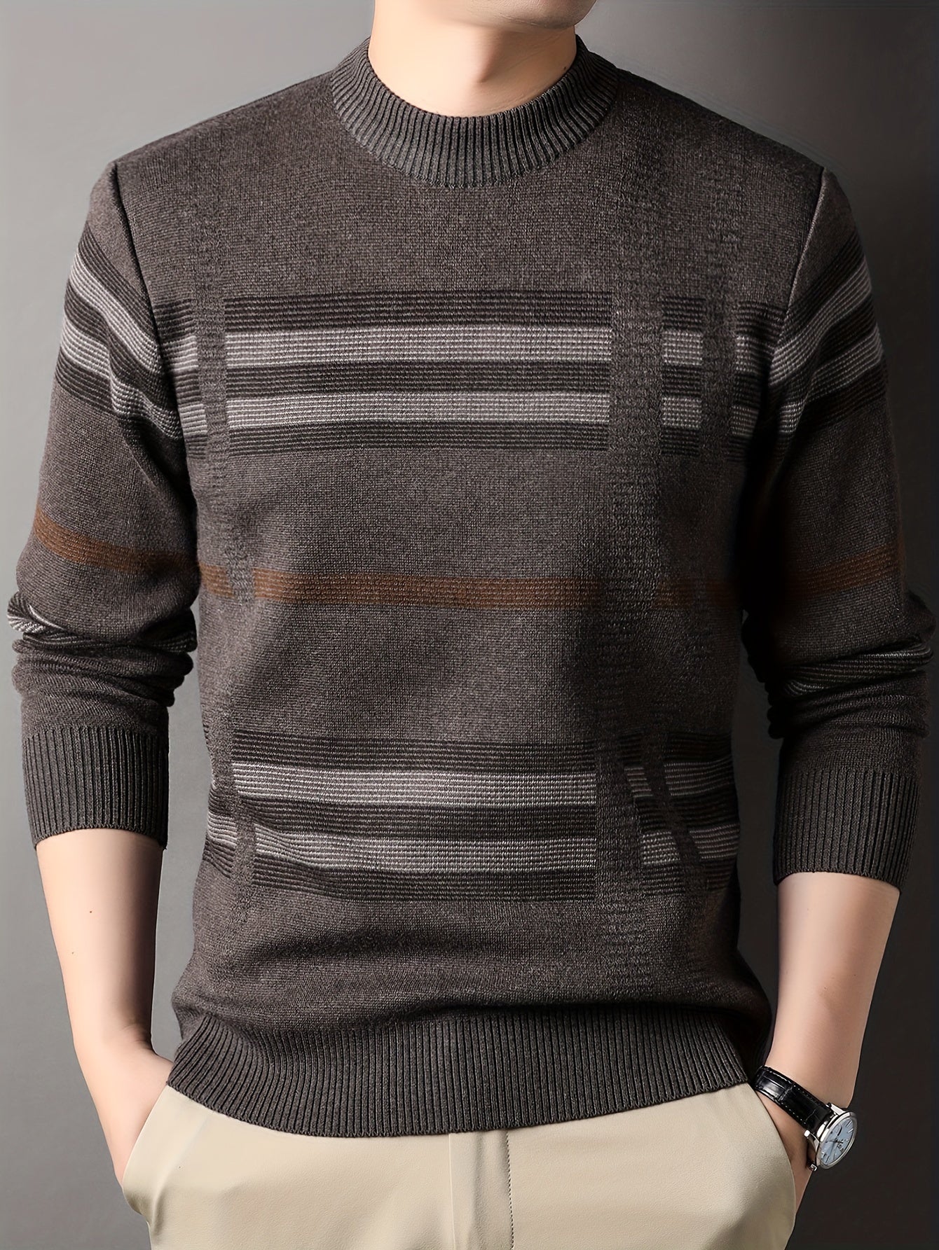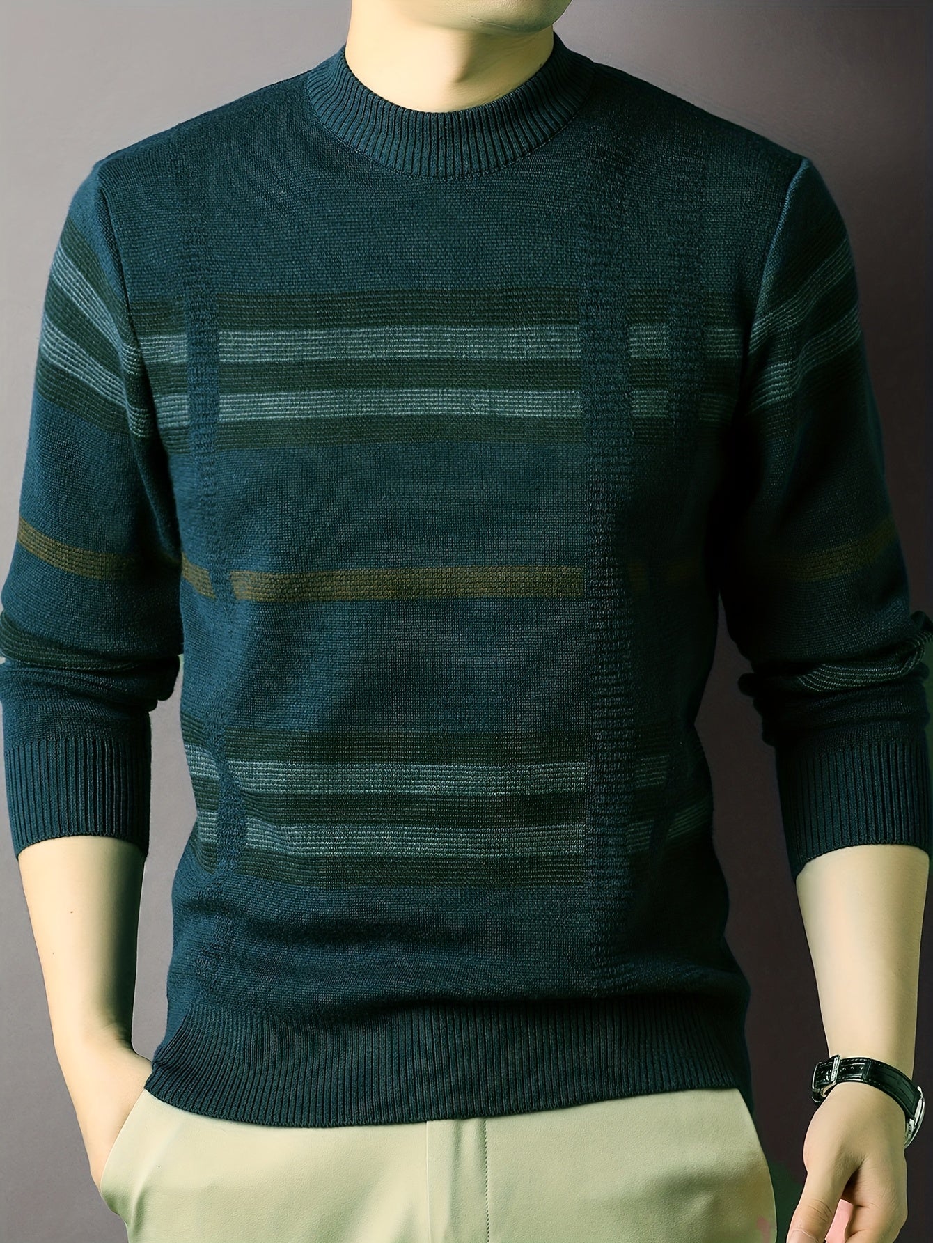 Men's Thick Winter Sweater Slim Fit Striped Knit Pullover - Soft Stretch Round Neck Long Sleeve Casual Shirt for Autumn & Cold Weather, Holiday Sweater, Medium Elasticity Fabric